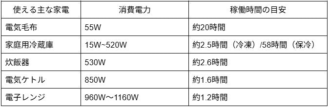 以下に、よく使う家電の消費電力の目安をまとめたので、こちらを参考に定格出力が家電の消費電力をしっかり上回っていることを確認してください。
