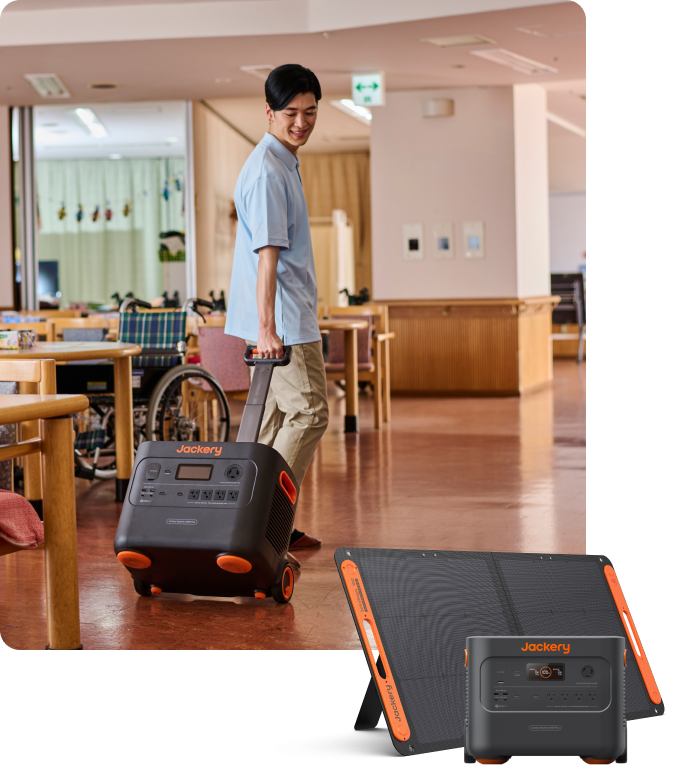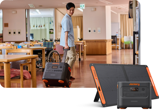 電池容量は数値が大きいほど電化製品も長い時間使用できます。そのため介護施設でのBCP対策においては、「暑さや寒さ対策」「通信手段確保」「調理」など業務継続のために優先すべき業務はなにか、その業務にはどのような機器を使用するかを見極めることが重要となります。使用機器の消費電力と稼働希望時間に基づいて必要な電力量を計算しておきましょう。 Jackeyのポータブル電源は288wh~3,042Whと大容量で、ソーラーパネルによる太陽光発電も可能。製品によっては容量が最大で12Kwh(一台)~24Kwh(二台並列)まで拡張することもできます。