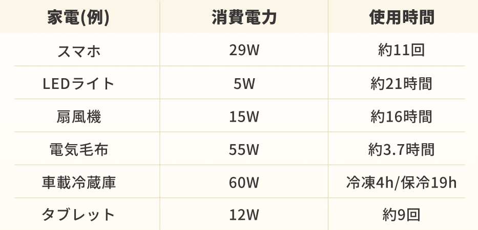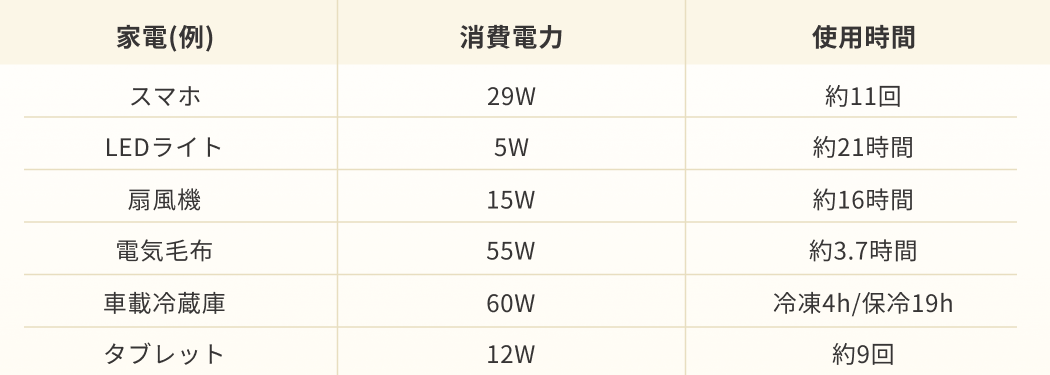 使える家電(例)とその稼働時間は下記: