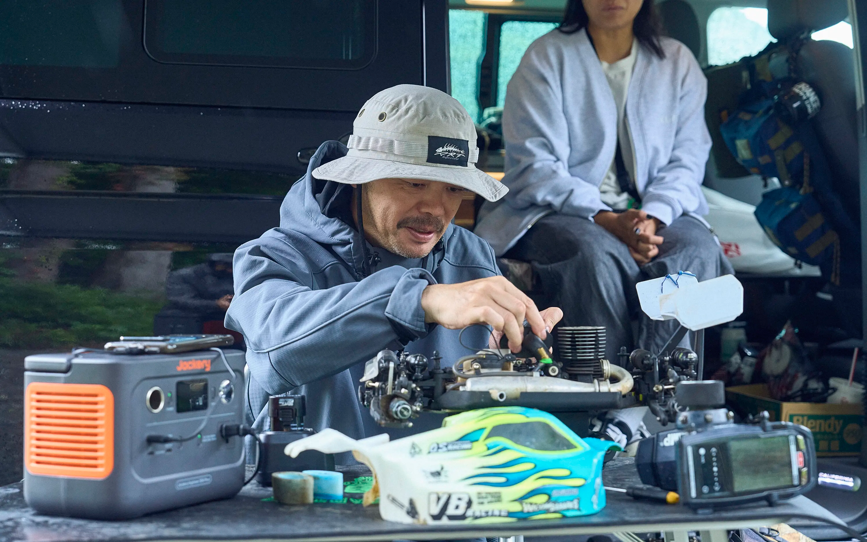釣具メーカーDRT代表の白川友也さんと、奥様の亜希子さん。業界では有名なビッグベイトの火付け役ですが、本稿の主題は釣りではなく、白川さんご夫婦がどハマりしている「ハチイチバギー」と呼ばれるラジコン。