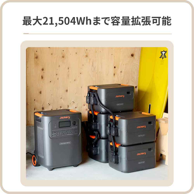 Jackery ポータブル電源3600 Plus専用拡張バッテリーは、ポータブル電源3600 Plus(別売)と接続することで、容量3,584Whから最大21,504Whへと拡張可能です。最大5台まで同時に接続することができ、大規模な電力供給が求められる状況でも、余裕を持って対応することができます。
