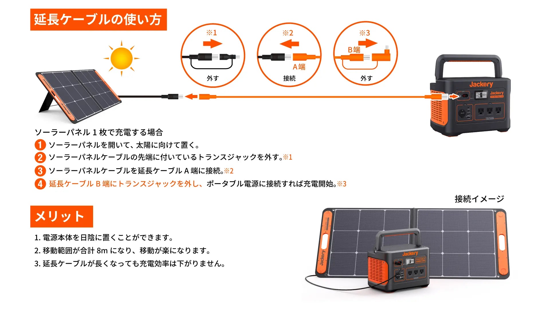 ※Jackery ポータブル電源1000+ソーラーパネル100*2枚 セットは並列接続ケーブルが付属されています。
