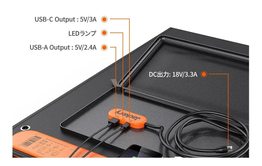「Jackery SolarSaga 100」は本体にUSB端子を備えているため、単体でもスマートフォン、タブレットの充電が可能です。折りたたんで持ち運ぶことができ、収納も便利です。