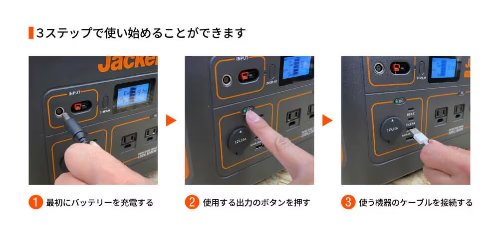 ACアダプターによるコンセントからの充電はもちろんのこと、180WのDC入力ポートを装備しており、コンセント充電する場合は約7.5時間でフル充電が可能。自動車のシガーソケットする場合は約14時間でフル充電が可能。Jackery SolarSaga 100を2枚使用すると、Jackery ポータブル電源 1000を10時間で充電できます。Jackery SolarSaga 100を1枚使用すると、Jackery ポータブル電源 1000を17時間で充電できます。