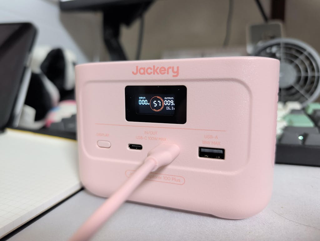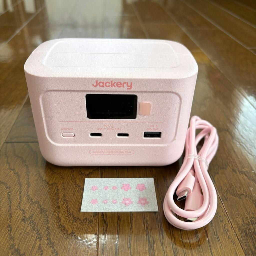 Jackery Explorer 100 Plusは、最大128Wで、USB-Cを2口、USB-Aを1口備えているため、複数のデバイスを同時に充電することができます。容量が99Whのため飛行機にも持ち込めます。手の平に乗るほど小型なので、ビジネスやアウトドアでも手軽に持ち運べます。