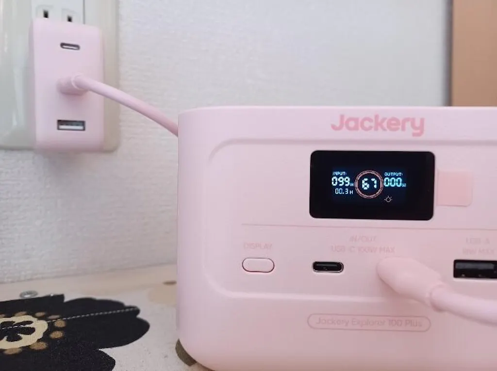 Jackery Explorer 100 Plusは、最大128Wで、USB-Cを2口、USB-Aを1口備えているため、複数のデバイスを同時に充電することができます。容量が99Whのため飛行機にも持ち込めます。手の平に乗るほど小型なので、ビジネスやアウトドアでも手軽に持ち運べます。