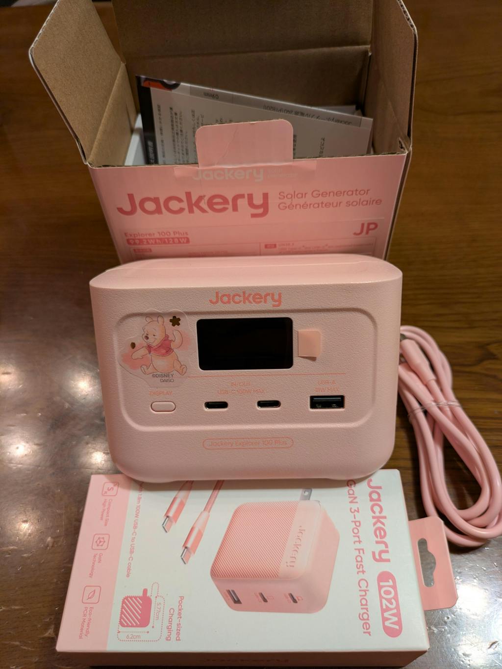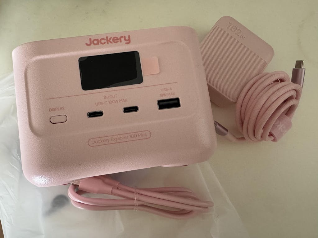Jackery Explorer 100 Plusは、最大128Wで、USB-Cを2口、USB-Aを1口備えているため、複数のデバイスを同時に充電することができます。容量が99Whのため飛行機にも持ち込めます。手の平に乗るほど小型なので、ビジネスやアウトドアでも手軽に持ち運べます。