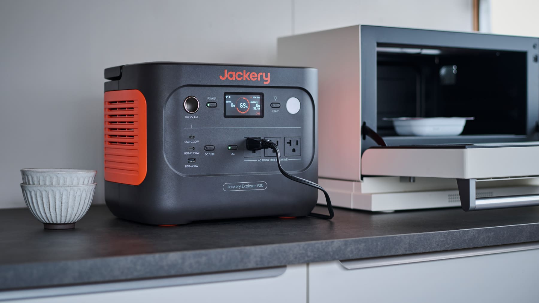 Jackery ポータブル電源 900はご家庭の壁のコンセントと同じ1500Wの定格出力のため、電子レンジや電気ケトルなどの出力の高い製品にも対応。停電時にも温かい食事を取ることができます。